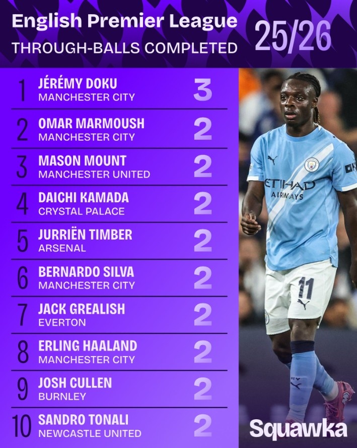 9月24日讯 本赛季英超战罢5轮,“Squawka”统计了所有球员成功完成直塞次数的排名,足球直播无插件免费在线观看曼城翼锋多库以3次领跑。