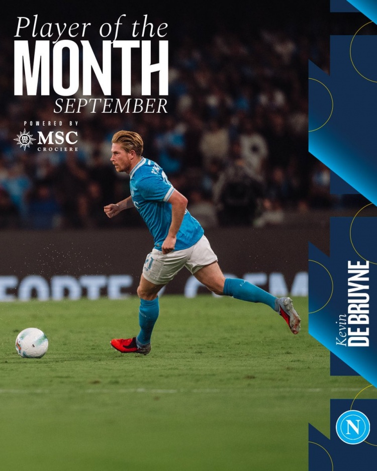 10月8日讯 那不勒斯官方宣布,德布劳内当选球迷票选的9月份最佳球员。