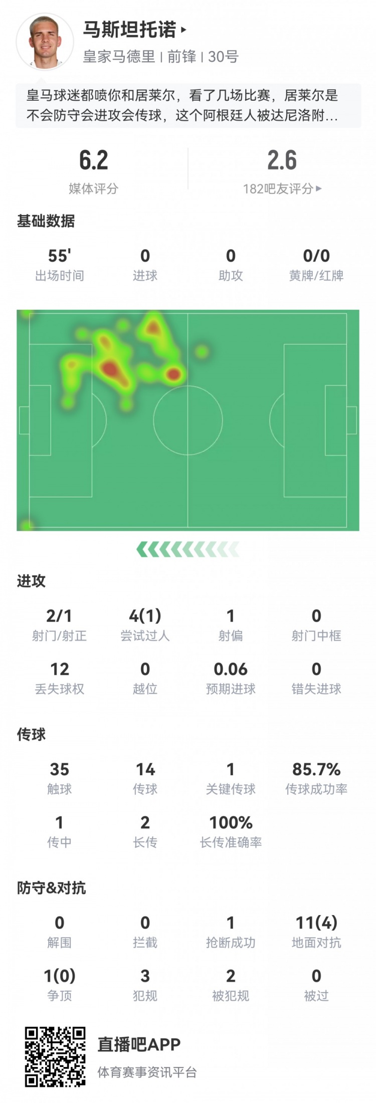 评分仅6.2!马斯坦托诺数据:2射1正,1次关键传送球 ,12次丢失球权